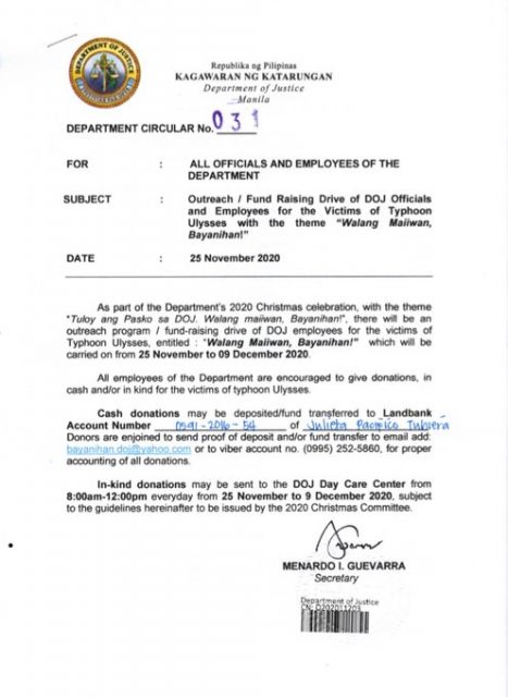 Sa department circular na may lagda ni Justice Secretary Menardo Guevarra, hinimok ang lahat ng mga kawani ng DOJ na magbigay ng donasyon para sa mga biktima ng nagdaang kalamidad.