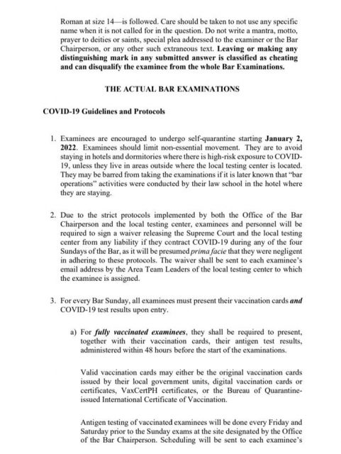 Ayon sa panuntunan, hinihimok ang mga bar examinees na sumailalim sa self -quarantine simula Enero 2, 2022.