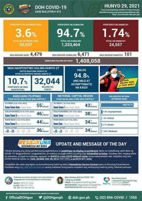 Itoy matapos na makapagtala ang Department of Health (DOH) ng 4,479 na bagong kaso ng COVID sa bansa habang 6,471 ang naitalang bagong gumaling.