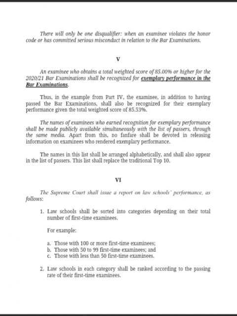 Gayunman, gagawaran ng pagkilala ng Supreme Court ang mga examinees na makakakuha ng grado na 85% o mas mataas pa para sa kanilang exemplary performance sa Bar exams.
