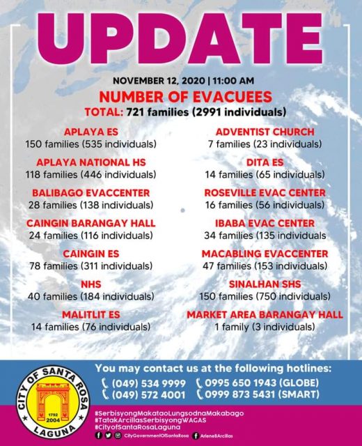 Sa pinakahuling datos ng lokal na pamahalaan, kabuuang 721 pamilya o 2,991 indibidwal ang pansamantalang nanunuluyan sa mga evacuation centers sa Santa Rosa.