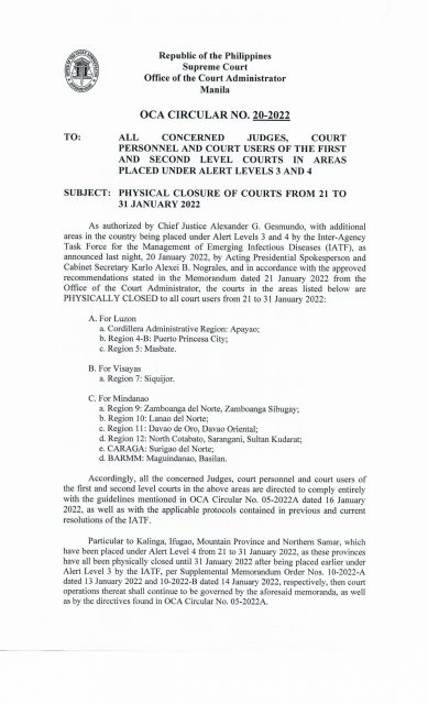 Sa sirkular ng Office of the Court Administrator, inilagay sa lockdown hanggang katapusan ng Enero ang mga hukuman sa 15 iba pang lugar.