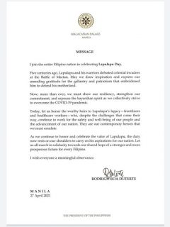 Nagpadala ng mensahe si Pangulong Rodrigo Duterte sa paggunita ng ika-500 anibersaryo ng digmaan sa Mactan sa pagitan ni Lapu-Lapu at mananakop na dayuhan na si Ferdinand Magellan.
