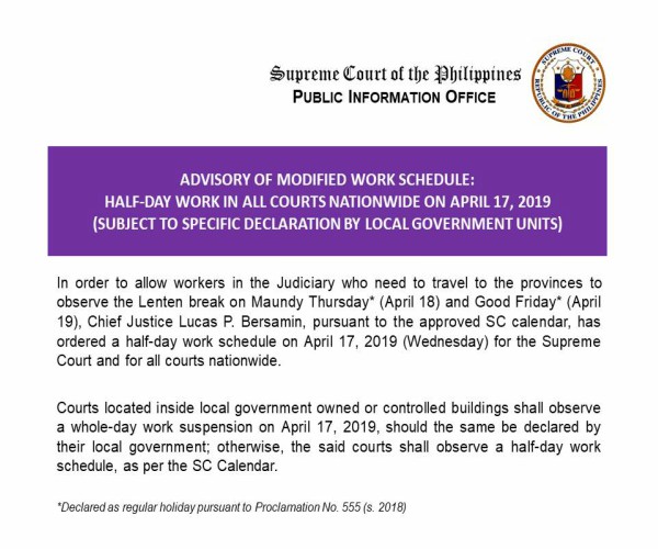 Hanggang alas-12:00 ng tanghali lamang ang pasok ng mga kawani at opisyal ng Korte Suprema at iba pang hukuman sa buong bansa sa Miyerkules, April 17.