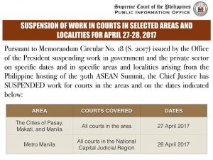 Sa abiso na ipinalabas ng Supreme Court Public Information Office, sa April 27, huwebes ,walang pasok sa trabaho ang lahat ng mga Korte sa lungsod ng Pasay, Makati at Maynila.