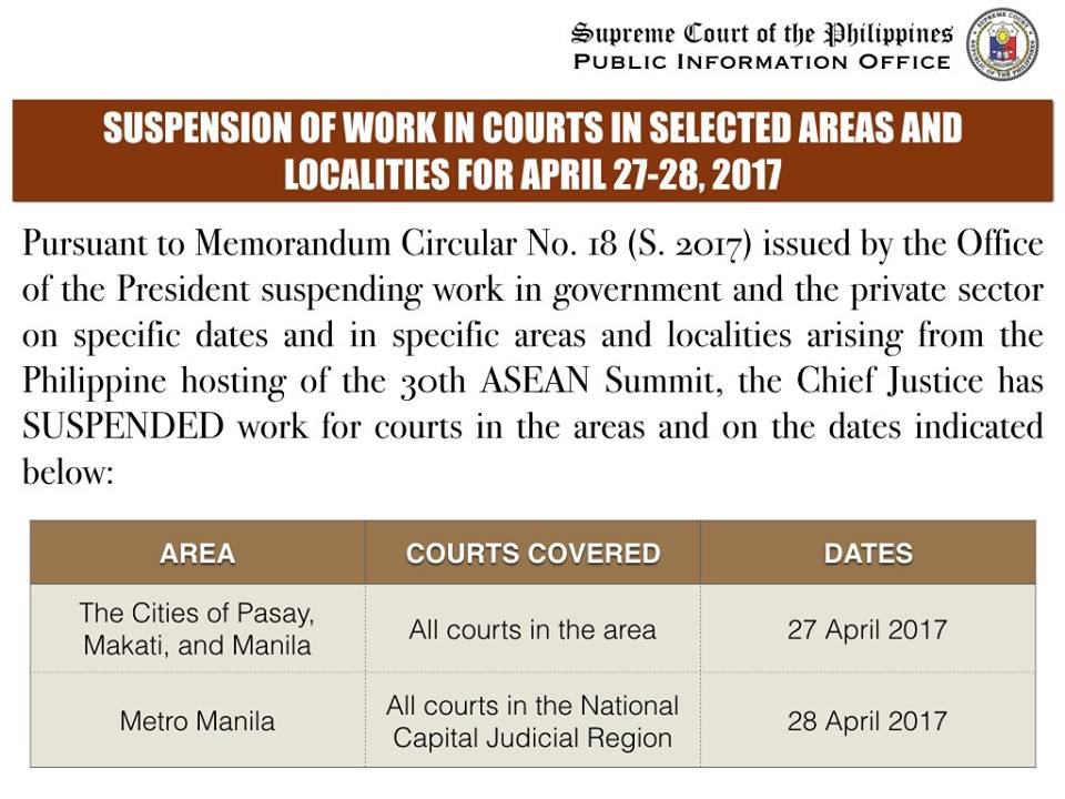 Sa harap ng mga aktibidad sa 30th ASEAN summit, sinuspinde ng Korte Suprema ang trabaho sa mga hukuman sa Metro Manila sa April 27 hanggang 28.