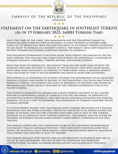 Kinumpirma ng Embahada ng Pilipinas sa Tûrkiye na namatay ang Pilipina at tatlo nitong anak na una nang iniulat na nawawala sa Antakya matapos ang malakas na lindol doon.